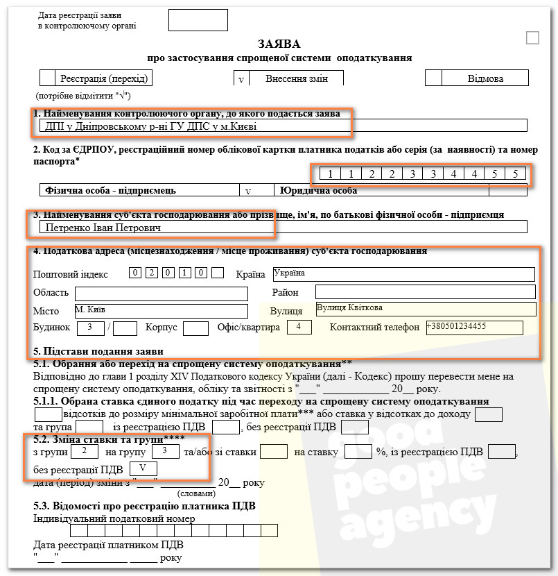 Пример заполнения Заявления на смену группу единого налога: